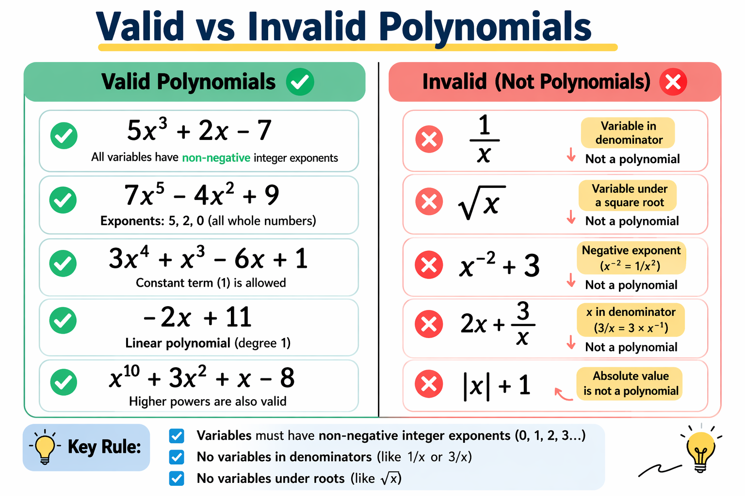 A polynomial is an algebraic expression consisting of variables, constants, and non-negative integer powers.